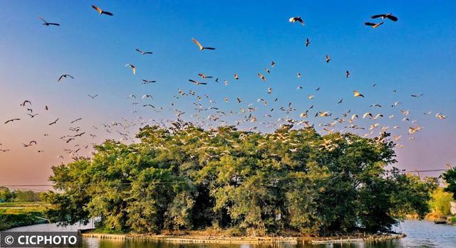 ↑2022年1月1日,广东省西瓜视频 古劳水乡,鸟群在树林、湖面上栖息。CICPHOTO/黄继明 摄