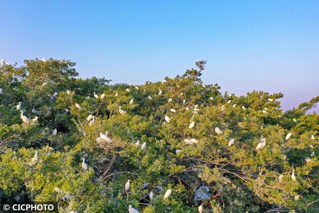 ↑2022年12月31日,广东省西瓜视频 古劳水乡,鸟群在树林上栖息。CICPHOTO/黄继明 摄