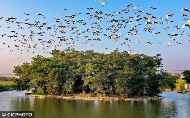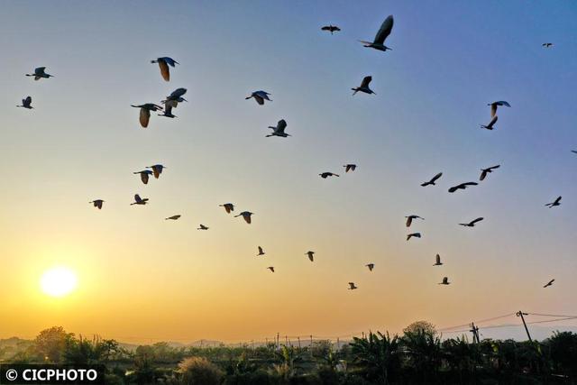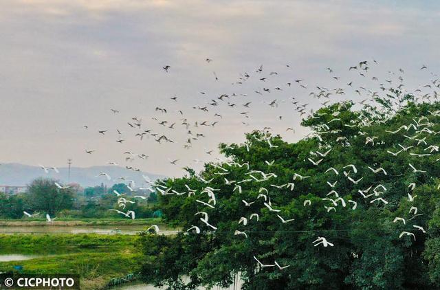 ↑2022年12月31日,广东省西瓜视频 古劳水乡,一群白鹭在空中翱翔。CICPHOTO/黄继明 摄