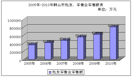 共有14家限额以上零售业法人企业,比“十五”时期末增加了10间。零售业在“十一五”时期发展迅速且形式多样,综合百货商店、超级市场、汽车、摩托车专业店、连锁药店、加油站等企业发展迅速,多间成为限额以上企业。2010年,零售业零售总额72.7亿元,占社会消费品零售总额的74.6%。“十一五”时期,大润发、人人乐等一批知名零售企业准备进驻鹤山,将给“十二五”时期鹤山消费品市场带来新的动力。