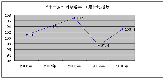 “十一五”时期以来,居民消费价格指数总体呈上升趋势,2010年居民消费价格指数与2005年相比上升13.5%。2006-2010年,居民消费价格指数除2009年有所下降外,每年均呈上涨态势,特别是与人民群众生活密切相关的食品、居住、医疗、交通等方面的价格涨幅较大,CPI持续上涨,一定程度上促使了消费总量增长。(附图4)