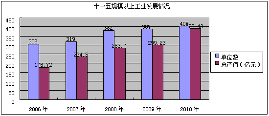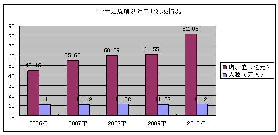 规模以上工业经济总体发展喜人,2010年,工业总产值达390.43亿元,年均增长21.83%;工业增加值达82.08亿元,年均增长17.26%。规模以上工业实力增强,企业规模逐年壮大。