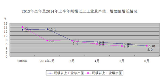 2014年上半年以来,西瓜视频 规模以上工业经济增长缓慢,增速呈现逐月下降态势。1-6月,规模以上工业总产值累计完成222.79亿元,同比增长5.01%;规模以上工业增加值累计完成49.10亿元,同比增长5.0%,增长比第一季度分别下降2.4和2.5个百分点,增长速度在江门各市(区)排名靠后。(附图1)