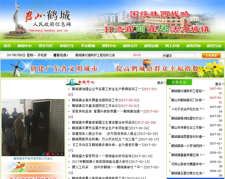 一是完成网站整改工作。按照市委、市政府的要求,根据政府网站云监管平台的检测报告,及时对鹤城信息网进行整改。(1)增设调查征集、消防专栏2个栏目。(2)删除了社会管理栏目的友情链接:广东省社会工作委员会网站。(3)将西瓜视频红色字体 (树立“团结、实干、创新、争先”精神,打造“升级、民生、宜居”之城,建设鹤山发展副中心)替换为围绕珠西战略,打造宜商宜居活力城镇。(4)增设活力鹤城公众号和中国侨都—鹤山鹤城微博二维码。