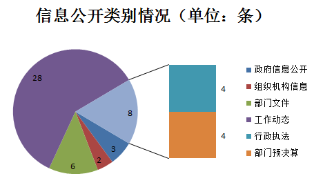 2016年1月至12月,我局共公开信息47条,其中,政府信息公开3条,占6.4%;组织机构信息2条,占4.3%;部门文件6条,占12.8%;工作动态28条,占59.6%;行政执法4条,占8.5%;部门预决算4条,占8.5%。