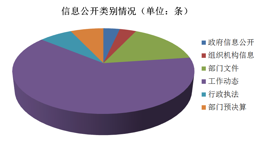 2017年1月至12月,我局共公开信息57条,其中,政府信息公开2条,占3.5%;组织机构信息2条,占3.5%;部门文件9条,占15.8%;工作动态36条,占63.2%;行政执法4条,占7.0%;部门预决算4条,占7.0%。
