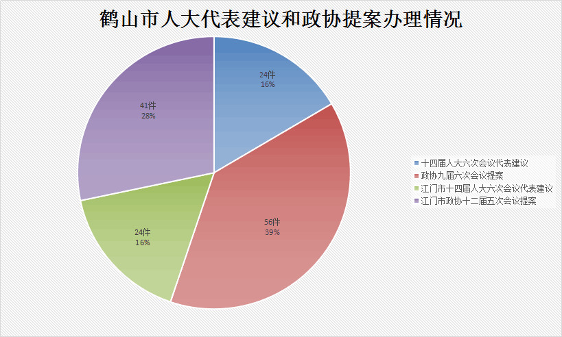 2016年共办理答复人大代表建议、政协提案145件,满意率达100%。其中,共收到十四届人大六次会议代表建议24件,占16.6%;政协九届六次会议提案56件,占38.6%;收到江门市十四届人大六次会议代表建议24件,占16.6%;江门市政协十二届五次会议提案41件,占28.2%。