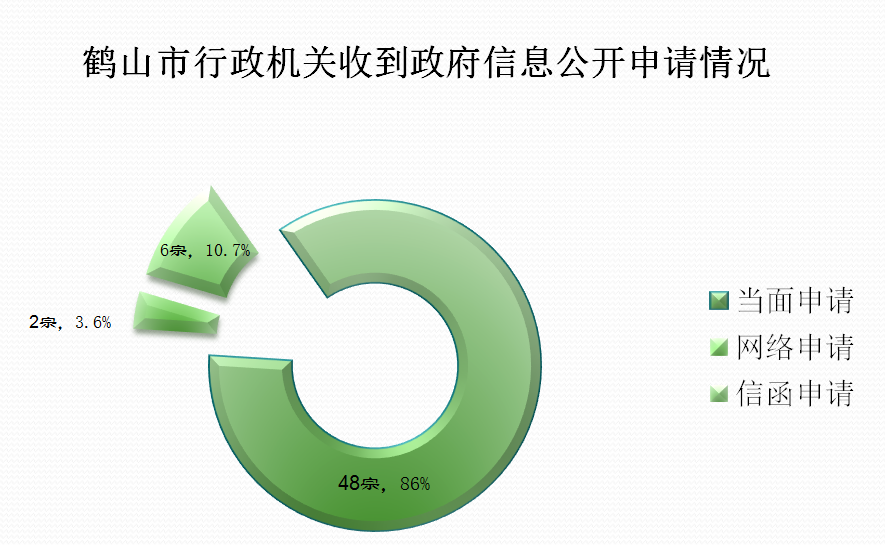 我市在政府门户网站设立了“政府信息依申请公开”专栏,群众通过当面申请、网上申请、来信申请等方式全市行政机关收到政府信息公开申请共56宗。其中,当面申请48宗,占85.7%;网络申请2宗,占3.6%;信函申请6宗,占10.7%。