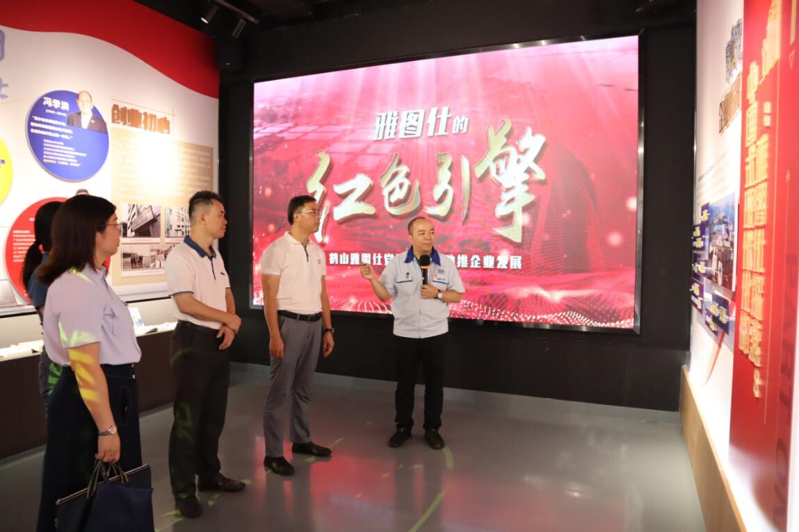 调研团参观了警务治安调解室,认真听取了雅图仕公司生产经营和创建全国和谐劳动关系示范企业的工作情况,实行“法理情”管治,把企业管理和国家政策法规有效衔接,贯彻企业现代化法治理念。在暨大教育学院江门分院,调研团了解雅图仕公司《校企合作产教融合三年规划(2022—2024年)》的发展思路、合作模式、重点工程、保障机制等,以及如何发挥产教融合型企业在技术技能人才培养中起到的带动引领示范作用。在侨心向党展厅,调研团了解到雅图仕公司党委党校是全省第一所新型侨资民企党校,发挥侨资党校优势,积极服务于广大非公企业、“两新”党组织、侨资企业、商会、协会等组织。冯杰晖同志表示,非公企业党校要遵循“党校姓党,党建引领,服务大局,开拓创新”的原则,把党建工作优势转化为企业发展优势,以党建引领民企实现高质量发展。