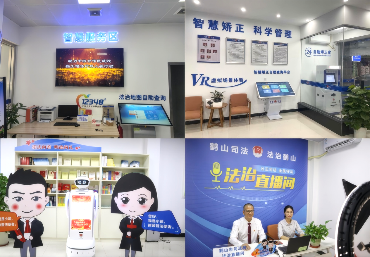 融入互联网、物联网、云计算、大数据、人工智能、区块链为代表的现代信息科学技术,将法治化思维与智慧化手段相结合,让法治成果更全面、及时、公平地惠及群众及企业。一是创新智慧社会治理。配备24小时自助入矫机、人面识别报到机、AI心理辅助检测、VR情景模拟等设备,与省社区矫正一体化平台对接,形成智能化管理决策与指挥调度为一体的社区矫正信息化体系;“广东省一体化行政执法平台”与江门市12345政府服务热线、“综治网格平台”数据融合衔接,“一屏掌控”实现县级执法数据全局性、可视化、扁平化监督管理,创新“无人机巡航+智能分析”等科技执法方式,乡镇综合行政执法从“平面”转为“立体”,打通精细化治理“最后一公里”。二是提供智慧公共法律服务。引进22台公共法律服务“云平台”人工智能终端设备,实现市公共法律服务中心、律师事务所和镇(街)司法所互联互通。与腾讯公司开展合作,在龙口镇上线启用智慧表决云平台,以信息化“小切口”驱动全过程人民民主“大场景”。布局成立中欧合作区涉外公共法律服务工作站、青年创业就业法律服务工作站、青创权益保护分中心、深圳国际仲裁院江门中心(江门仲裁委员会)鹤山联络服务站等阵地,为创业创新畅通纠纷处理绿色通道。持续优化“互联网+公证”服务,加大知识产权保护力度,为市场主体纾困解难,为制造业当家“一把手工程”保驾护航。三是拓宽智慧普法广度。为市民开放普法电子阅览专区,配备鹤山“法治之声”普法平台、普法机器人“小普”以及获国家版权登记著作权的“小司”“小律”鹤山普法小使者;联动三级法治直播间(县级法治直播间、“法治鹤山”公众号平台+雅瑶镇法治直播间、鹤城镇抖音号、龙口镇普法微课堂、双合镇法治讲习所),让法治宣传教育覆盖100多万人次。鹤山普法依法治理工作连续五年被省评为优秀等次,形成新时代基层社会治理的“鹤城模式”,成功创建“全国民主法治示范村”2个、“广东省民主法治示范村”6个,全面助推“百县千镇万村高质量发展工程”。