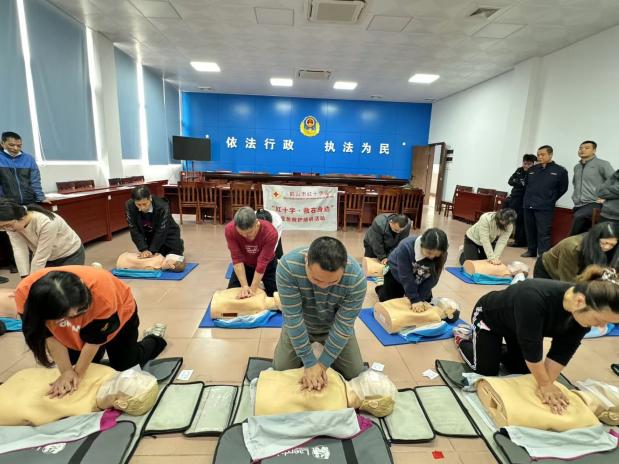 本次培训特邀市红十字会急救专家团队授课,采用“理论讲解+模拟实操+考核认证”三阶式教学模式,重点讲解了心肺复苏(CPR)的操作流程、自动体外除颤仪(AED)的使用方法以及常见急症的现场处置等内容。通过现场模拟执法过程中可能出现的交通事故、群体性事件、突发疾病等场景,一对一指导队员明晰急救流程、练习胸外按压、人工呼吸及AED设备操作,确保每位队员均能规范完成“黄金四分钟”急救流程。本次培训共有52名执法队员参加,全员通过操作考核并取得心肺复苏(CPR+AED)培训证书。