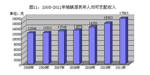 城镇居民年人均可支配收入17593元,增长11.6%。年人均消费性支出14816元,增长20.8%。按大类分,食品类支出5846元,增长6.1%;衣着类支出799元,增长31.9%;居住类支出1514元,下降6.4%;家庭设备用品及服务类支出1018元,增长49.6%;医疗保健类支出496元,下降12.0%;交通通讯类支出2978元,增长80.7%;教育文化娱乐服务类支出1704元,增长25.5%。全年农民人均收入9548元(农村调查统计口径),增长11.0%。在岗职工年均工资收入30435元(初步数据),增长17.9%。