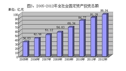 2012年固定资产投资99.04亿元,增长8.5%。按投资结构分,基础设施投资26.29亿元,增长69.1%;其他投资49.83亿元,增长12.2%;房地产投资22.92亿元,下降26.9%。按产业分,第一产业投资1.78亿元,增长44.9%;第二产业投资56.08亿元,增长36.4%;第三产业投资41.18亿元,下降15.8%。