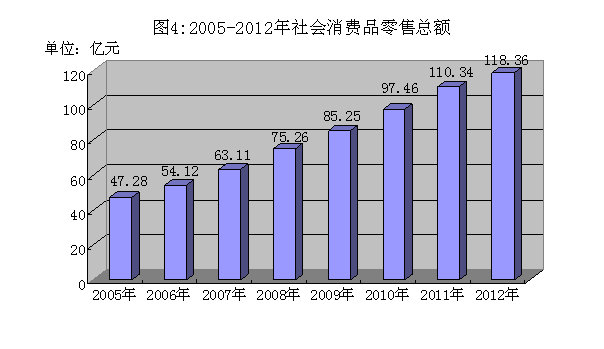 2012年全市实现社会消费品零售总额118.36亿元,增长11.7%。按行业分,贸易批发业零售额9.51亿元,增长9.0%;贸易零售业89.47亿元,增长11.9%,以上两者占全市社会消费品零售总额的83.6%;住宿业零售额0.54亿元,下降3.0%;餐饮业零售额18.84亿元,增长13.1%。按所在地分,城市消费品市场零售额71.07亿元,增长11.5%;农村消费品市场零售额47.29亿元,增长12.1%。