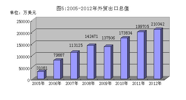 2012年全市外贸出口总值21.03亿美元,增长5.3%。按贸易性质分,一般贸易出口8.94亿美元,增长20.4%;加工贸易出口12.10亿美元,下降3.6%。按企业性质分,民营企业出口5.80亿美元,增长21.1%;三资企业出口15.24亿美元,增长0.4%。主要出口商品中,机电产品出口总值9.64亿美元,增长4.3%;印刷品出口总值3.64亿美元,增长5.1%;纺织品出口总值2.68亿美元,增长2.7%;鞋类出口总值0.90亿美元,增长8.6%。主要出口地区中,美国出口总值4.75亿美元,增长0.6%;欧盟出口总值4.08亿美元,下降4.7%;香港出口总值5.31亿美元,增长1.8%。全年外贸进口总值4.48亿美元,下降3.0%。