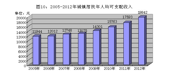 城镇居民年人均可支配收入19842元,增长12.8%。年人均消费性支出15675元,增长5.8%。按大类分,食品类支出5932元,增长1.5%;衣着类支出835元,增长4.5%;居住类支出1621元,增长7.1%;家庭设备用品及服务类支出1095元,增长7.6%;医疗保健类支出625元,增长26.0%;交通通讯类支出3130元,增长5.1%;教育文化娱乐服务类支出1946元,增长14.1%。全年农村居民人均纯收入10741.75元(统计局农村调查统计口径),增长12.5%。西瓜视频 2012年城镇非私营单位在岗职工平均工资35044元,增长15.2%