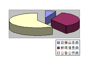 镇人民政府网主动公开包括了产业发展政策、项目建设规划、招标公告等方面的内容信息333条,其中,政策、业务类信息20 条,占6%;镇人民政府新闻信息118 条,占35%;公告公示类信息195条,占59 %。
