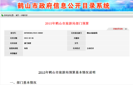 (四)做好预算信息公开工作。为进一步提高政府预算透明度,推进政府预算信息公开工作,2015年2月,我局在门户网站上公开了政府预算信息《西瓜视频 旅游局2015年部门预算》。