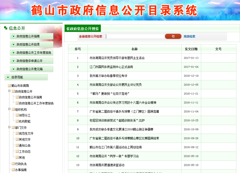 体育局政府信息公开目录》在网上发布。内容包括政务信息公开方式、范围,信息公开地址、受理机构、依申请公开程序和监督申诉方式等。