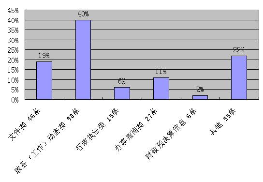 2015年,我局主动公开政府信息247条,其中市卫生计生局门户网站193条,在“中国.鹤山”门户网站120多条,其中文件类信息46条,占19%,政务(工作)动态类信息98条,占40%,行政执法类信息15条,占6%,办事指南类信息27条,占11%,财政预决算信息6条,占2%,其他信息55条,占22%(见图2)。