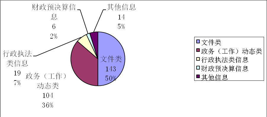 2018年,我局主动公开政府信息286条,其中文件类信息143条,占50%,政务(工作)动态类信息104条,占36%,行政执法类信息19条,占7%,财政预决算信息6条,占2%,其他信息14条,占5%(见图2)。通过政务微博公开信息107条;通过微信公众号公开信息138条。