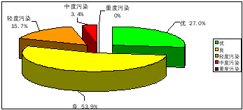 2018年第一季度西瓜视频 区空气质量达标天数比例平均为80.9%,其中优占27.0%(24天),良占53.9%(48天),轻度污染占15.7%(14天),中度污染占3.4%(3天),无重度污染天数。
