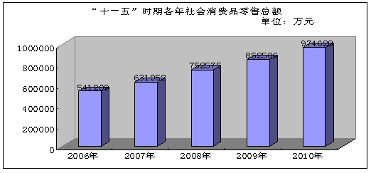 消费品市场的发展有赖于社会环境的稳定和各行业的发展,只有社会稳定、繁荣、人民生活水平提高,消费品市场发展才有坚实的支持。2010年我市完成生产总值160.62亿元,比上年增长14.1%,五年年均增长13.8%,比“十五”时期平均增速提高3.3个百分点。人均生产总值超过5000美元。“十一五”时期,综合实力显著增强、发展质量高、城乡面貌变化大、人民群众得到实惠。和谐稳定、不断发展的社会环境给消费品市场发展打造了一个坚实的后盾。
