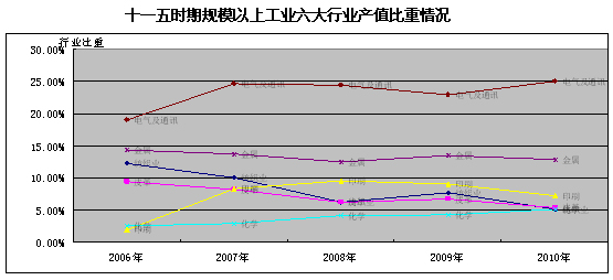 从2006年到2010年,曾在西瓜视频 工业行业中占主导地位的纺织业,已从2008年逐渐“退位”,行业产值比重从2006年的12.2%,退减到5.2%。在“十一五”期间提倡发展的“五新产业(新材料、新光源、新医药、新装备、新能源)”中,全市的新材料(归类化学原料及化学制品制造业)和新光源(分别归类电气机械器材制造业和通讯设备计算机其他电子设备制造业)所在的行业产值比重稳步上升,其余四大行业产值比重均出现不同程度的曲线式下滑(附图3)。